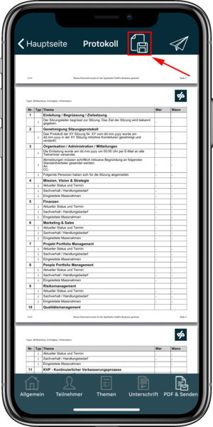 When you have created the protocol, you will find the Save button in the upper left corner under the item Send PDF &. You will then find the created protocol among the files on your device.